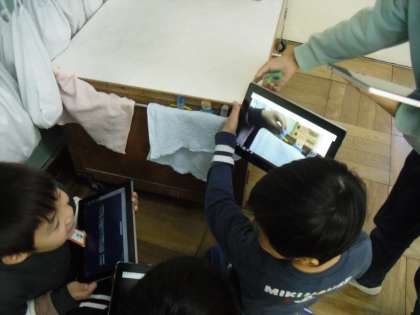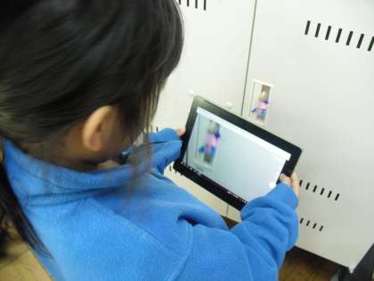 隙間テープを使って小さいオリジナル人形をつくり、教室の様々な隙間においてタブレットで撮影しました。