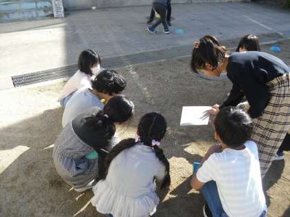 今日は「鏡ではね返した日光は、どのように進むのか」という学習問題について実験をして考えました。実験では鏡ではね返した日光の道筋を地面にうつしたり、下敷きに当て、その下に目印をおいたりして日光の進み方を調べました。結果として、はね返した日光は鏡の向きがどんな向きでもまっすぐに進むことが分かりました。みんな実験をしながら、グループの中でわかったことや気づいたことを交流しながら活動ができていました!