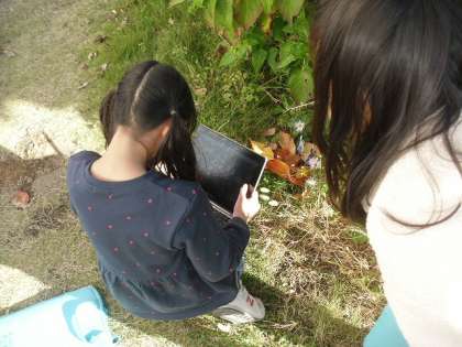 図工では「小さな自分」のお気に入りという学習をしました。この学習では、写真で撮って縮小した「小さな自分」を使って、学校の中の楽しい場所を探します。「小さな自分から見るとどんなふうに見えるのかな?」とみんないろいろな場所でタブレットのカメラを使いながら想像し、写真を撮りました。交流をした時には、自分とは違う見方や考えで撮っている友だちの写真を見て、さまざまな感想を伝え合っていました。