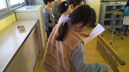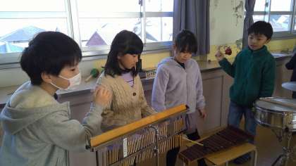 音楽では、グループごとに「まほうの音楽」を作っています。木琴、ウインドチャイム、シンバル、小太鼓などまほうがかかるイメージに合う楽器とどのように演奏するかを決め、練習しました。「ここは優しくしよう。」、「ウインドチャイムは低い音から高い音の順で鳴らそう。」などグループで話し合い、工夫している様子が見られました。