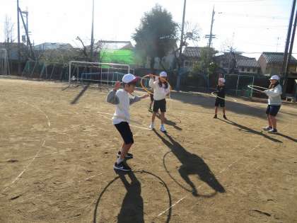 体育では「フレアースポーツ」をしました。フープや棒、ボールを使ってさまざまな活動に取り組みます。ペアの人と協力したり、アドバイスし合って楽しく活動したりすることができました!