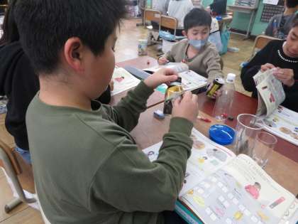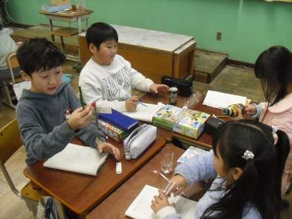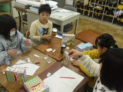 理科では「どのようなものがじしゃくに引きつけられるのだろうか」と学習問題について実験をして考えました。実験の結果から「鉄のくぎは磁石に引き付けられたけれど、銅のくぎは引き付けられないね。」、「電気の時と違って、金属すべてがじしゃくに引き付けられるわけではない。」、「鉄だけが磁石に引き付けられる。」などとたくさんのことに気づくことができました。