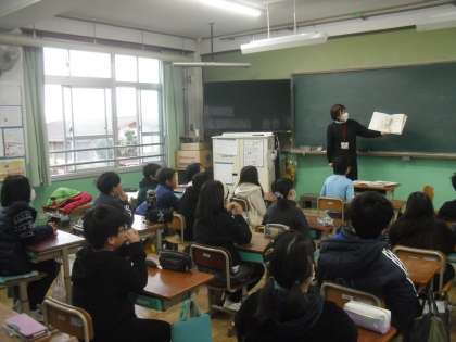 朝の読書の時間「さわやかタイム」に、地域の図書ボランティアの方々に本の読み聞かせをしていただいています。今回は、「せかいのくにでいただきます」や「オニのサラリーマン」などのお話を読んでいただきました。展開が楽しみであったり、他の国の言葉が聞けたりと、どの子も興味津々で読み聞かせを聞いていました。