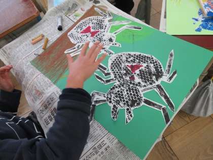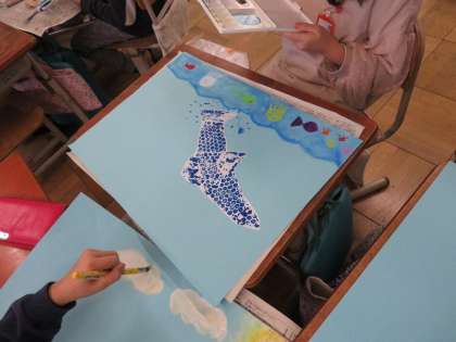 図工では、版画の学習の仕上げにはいっています。刷った版を画用紙に貼り、「生き物がいきいきと過ごす世界」になるように絵を描き足しました。「クジラの近くには何がいるかな。」、「鳥が楽しんでいる世界はどんな様子かな。」、「仲良しな様子はどうすれば伝わるかな?」とたくさん想像し、思い思いの世界を描いていました。