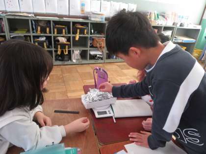 理科「ものの重さ」の学習では、いろいろな物の重さについて学習しています。これまでの学習で、「色紙で作ったものを量ったら○gだったよ。」、「そのままの色紙と折った色紙とでは、厚みが違うから重さも変わるのでは?」と考えていました。