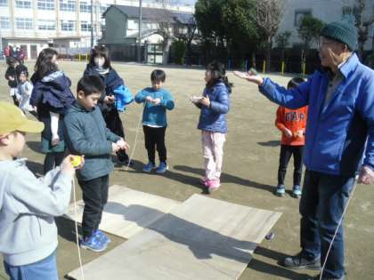 地域団体の皆様にお世話になり、久しぶりに開催されました。おもちをついている様子はなかなか見ることができないので、子どもたちも大変喜んでいました。きなこもちやおぜんざいでつきたてのおもちを味わいました。また、昔あそびとして、こままわし、はねつき、紙飛行機とばしなど、地域の方に教えていただきながら楽しみました。