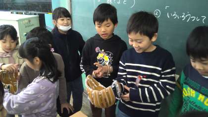 2月中、各クラスにメジャーリーガーである大谷翔平選手寄贈グローブを回しています。2月の朝会で紹介されてから楽しみにしていたため、子どもたちは大喜びで手にはめていました。子どもたちは、「サインが入っている!」や「見た目がかっこいい!」、「大谷選手からの手紙もあるの!?」などいろいろな反応でした。