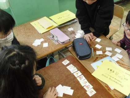 また日課カードならべをして、1日の日課を順に友だちと声を出してくり返し発音することで、言い方を覚えていきました。