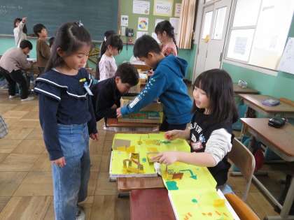 理科では2年2組を招待しておもちゃショーを開きました。遊び方を説明したり、一緒に遊んだりしながらお互い楽しそうに活動する姿が見られました。振り返りでは2年生から「楽しかったよ!」、「迷路がおもしろかった。」などと感想を言ってもらえて、3年生もうれしそうでした。持って帰ったおもちゃについてどんな仕組みを使ったのかをぜひおうちの方にも紹介してほしいと思います。