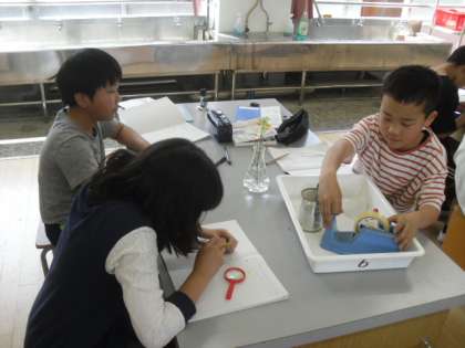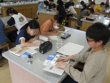 理科「花のつくり」の学習では、アブラナの観察をすることで、花のつくりを調べました。虫眼鏡でよく観察したり、ピンセットでおしべやめしべなどを一つ一つ取ったりすることで、花のつくりを知ることができました。