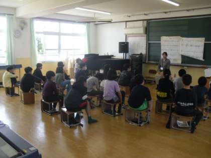 今日は、5年生になって初めて音楽科の学習をしました。今年度赴任してきた村中先生とも初めての学習で、ドキドキした様子で授業が始まりました。