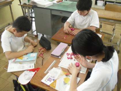 算数科では、「体積」の学習を始めました。今日は、教科書で示された直方体が1辺1cmのブロック何個分かを調べました。小さいブロックを器用に並べ、調べることができました。また、1辺1cmの立方体の体積は、1cm³と表すことができることも知りました。