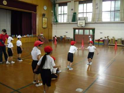 コーンを一周まわったり、ジグザグコースに挑戦したりして、りれえあそびをみんなで楽しんでいます。