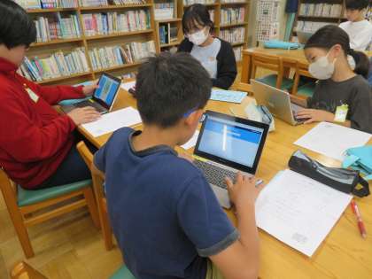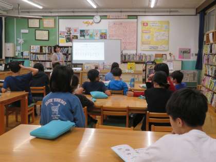 図書館の使い方について司書の先生からお話をしていただきました。昨年度から導入された「カーリル」を使って図書館の本について調べたり、分類について考えたりしました。語彙を増やしたり想像力を養ったりするためにも、さまざまな本のジャンルにふれ、たくさん本を読んでほしいと思います。