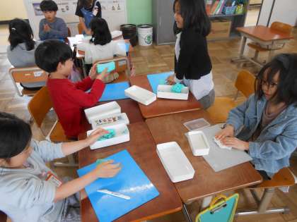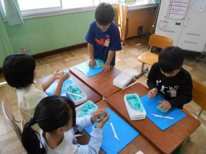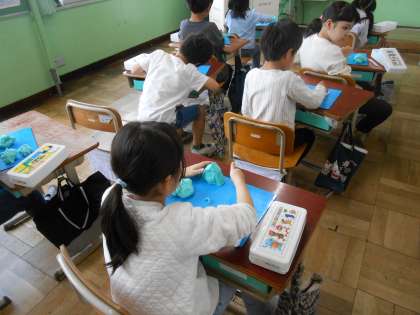 図画工作科「にぎにぎねん土」の学習では、粘土を握ってさまざまな形を作りました。「どんな形かな?」「何ができるかな」と、できた形から表したいことを考え、工夫して表しました。ふしぎなお城や生き物などたくさんの素敵な作品を作ることができました。