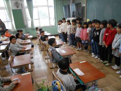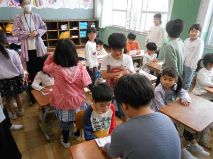 生活科の学習で一緒に学校探検に行く1年生と顔合せ会をしました。顔合せ会では、作った「よろしくね名刺」を1年生に渡しました。