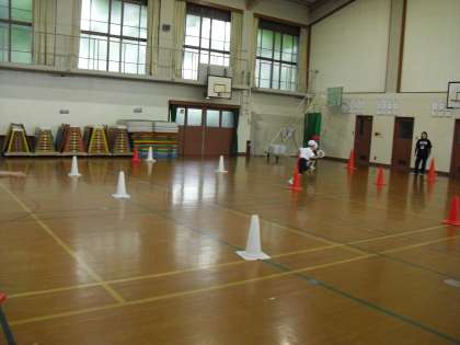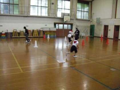 コーンをくねくね回って走るのは、少し難しそうでしたが、みんなで応援し合って、楽しそうに走っていました。