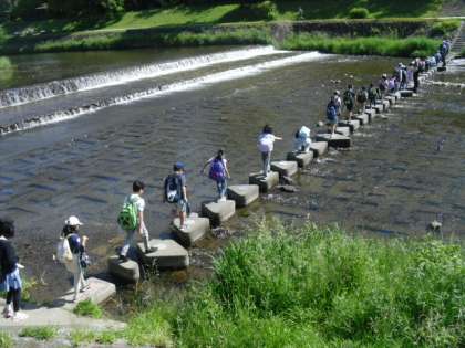 朝学校に集合して、みんなで歩いて植物園へ向かいました。途中に、賀茂川の飛び石があり、みんなで渡ると、植物園に到着しました。