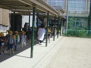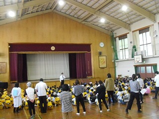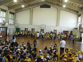 5月20日(月)台風がおこったときの避難訓練をしました。教室で校内放送を聞き、その後体育館に学級ごとに集まりました。全員がそろったら、学校待機と集団下校に分かれ、最後に校長先生のお話を聞きました。