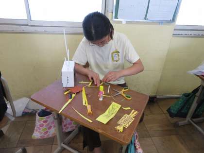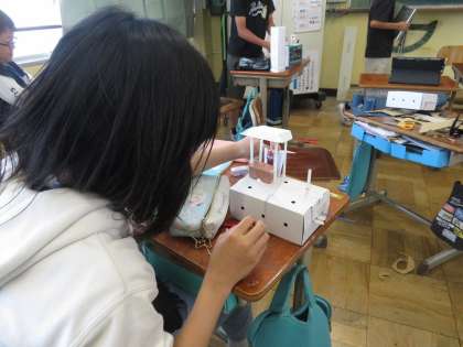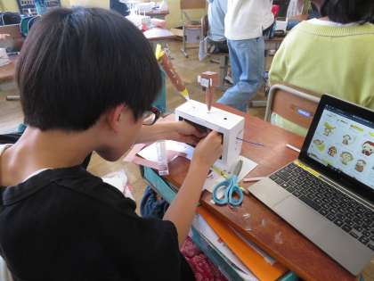 図画工作の「くるくるクランク」では、作品づくりに励んでいます。どんなものを作りたいかを決めて、画用紙や折り紙を使いながらイメージした作品になるように工夫している様子が見られました。