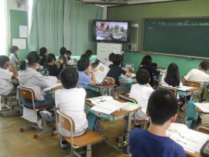 家庭科では、来週の調理実習に向けて、ゆでる調理のポイントを考えました。調理している映像などを通して、自分たちが取り組むときには何に気を付けようかと考えることができました。
