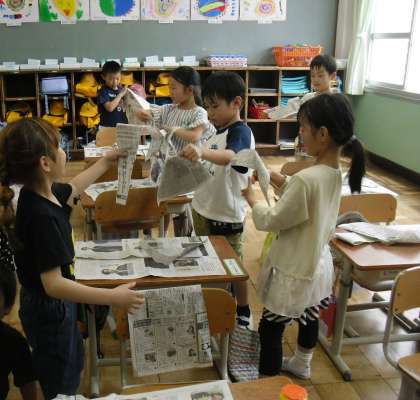 新聞紙をやぶいて、いろいろな向きから見つめてみると、いろいろなものに見えてきたようです。