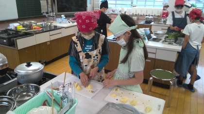 包丁の扱い方にも気を付けて取り組むことができました。家でのお手伝いで、調理に慣れている子どもたちが教えてあげる様子が見られました。