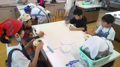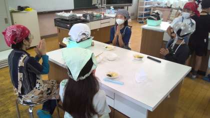 試食のときには「おいしくできた!」、「硬かったじゃがいもが柔らかくなっている!」と一生懸命作った料理をおいしく食べていました。調理しながら洗い物を済ませるなど、効率よく進め、最後まで責任を持って役割を果たすこともできました。
