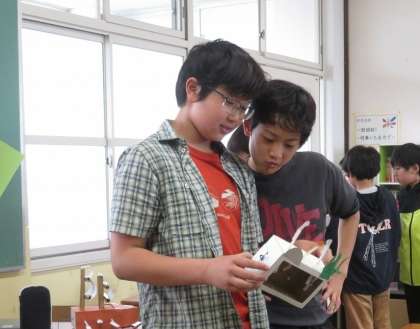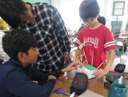 今日は「くるくるクランク」の鑑賞をしました。友だちの作品を実際に動かしたり鑑賞したりして、クランクの動きをいかした作品や自分には思いつかなかった発想の作品を見つけていました。