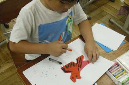 「トラの形に見えたから黄色と黒色で塗ろう。」「きょうりゅうに狙われているウサギができたよ。」と思いついたことを楽しみながら表現していました。