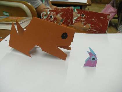 紙を折って立ち上がらせて、向きを変えたり切ったりすると、いろいろなものに見えてきたようです。