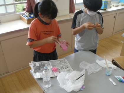 今月はスーパーボールを作りました。水や洗濯のり、食塩を混ぜて固め、思い思いの色を付けて完成させました。最初は思うように固まりませんでしたが、食塩を多めに入れた子が固まったことから、それを参考にして取り組むことができました。