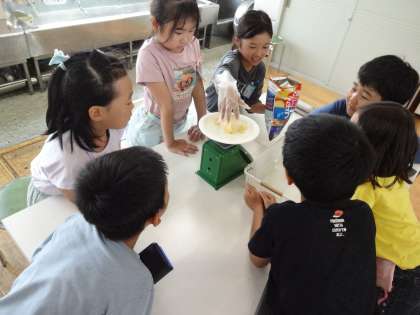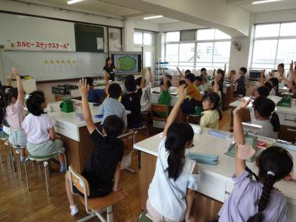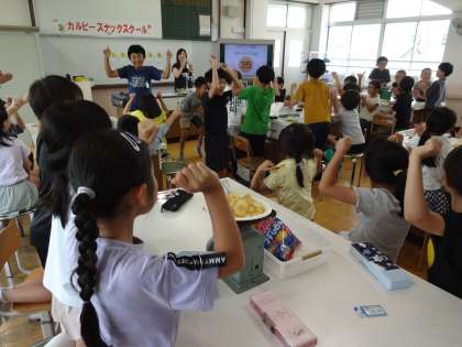 カルビースナックスクールに参加しました。おかしの食べる量やいつ食べると良いのか、パッケージの見方について学びました。また、ポテトチップスができるまでを映像を見ながら知りました。初めて知ることばかりで、子どもたちは終始驚きと学びがあった様子です。