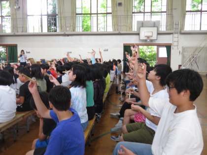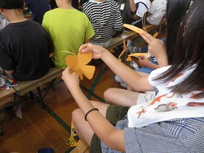 今日は文化庁公演で「落語・紙切り」を体験したり、見せていただいたりしました。ワークショップでは落語の中で使う扇子や手ぬぐいを貸してもらい、いろいろなものに見立てる技を教えていただきました。紙切りではみんなでちょうちょを作りました。お互いに作ったものを見せ合って交流しました。午後からは実際に落語、紙切りを見せていただきました。迫力のある公演に引き込まれ、みんな笑ったり歓声をあげたり楽しそうでした!