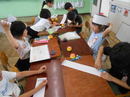 図画工作科「わっかでへんしん」の学習では、変身したいもののイメージを膨らませ、自分で作ったわっかに飾りをつけていきました。さまざまな材料を組み合わせたり、形を工夫したりして、自分だけのわっかを作ることができました。