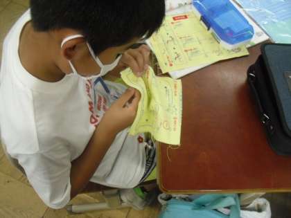 家庭科では、針に糸を通したり・玉結び・玉どめの練習をしたりしています。そして、なみぬいにも挑戦しました。「玉結び・玉どめは苦手だけど、なみぬいならできる!」と、新しい学習に意欲的に取り組んでいました。