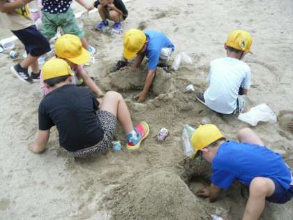 図画工作科「すなやつちとなかよしでは、砂場で山をつくったり、穴を掘ったり、型抜きをしたりして、土や砂の感触を味わいながら、造形活動を楽しみました。