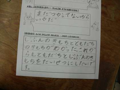 動物村のきつねのこんきちくんとうさぎのぴょんこちゃんの話から、自分の思いをどんなふうに伝えたらよいかを考えました。