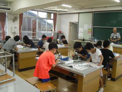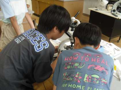 理科の学習で顕微鏡を使って、花粉の様子を観察しました。顕微鏡で使うことで細部の筋まで見ることができ、「ラグビーボールみたいな形だ!」とみんなワクワクしながら観察していました。