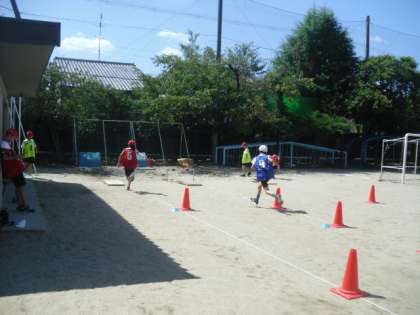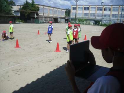 体育科「走りはばとび」の学習では、より遠くに跳ぶことができるよう練習しています。GIGA端末で撮影して空中姿勢を確かめたり、踏切板の奥にハードルを置いて高く跳ぶことを意識したりしながら取り組むことができました。