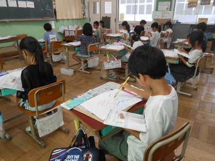 図画工作科の学習では、前の時間から引き続き、絵の具の使い方に慣れる時間でした。今回は、いろいろな筆の使い方に挑戦しました。ぐるぐる描きやてんてん描きなどさまざまな描き方を試してみました。子どもたちは「筆の使い方を変えるだけでぜんぜん違う!!」と驚いていました。