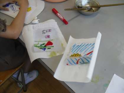 9月の科学クラブの活動では、「水にぬれない紙」を作りました。コピー用紙に油を塗って水に浸けると、油を塗ったところだけが破れにくくなったことから、水と油が溶け合わないことを確かめました。思い思いにイラストを描いて、その上から油を塗ることで、楽しみながら確かめることができました。