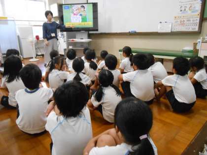 身体計測の前には養護の先生から、視力についてのお話をしていただきました。目を休める理由について実際に模型を使いながら教えていただき、早速子どもたちは遠くを見て、目を休めていました。