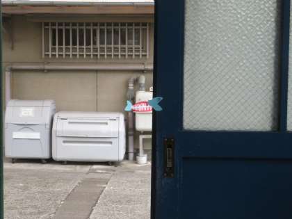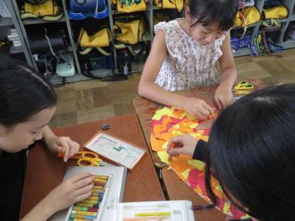 作品がだんだんと完成し、校内にいろいろな作品が貼られています。全校のみんなが楽しめるように、きれいに作品が見える位置に足形を貼ると、さっそくいろいろな学年が見て「すごい!」、「見えた!」と楽しんでくれていました!
