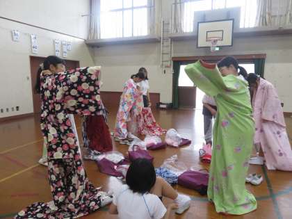 今日の総合では「きもの着付け体験」を行いました。来ていただいた先生に着物の歴史や染物についてお話をしていただきました。また一人ひとり着物を着せていただき、着た状態で歩いたり写真を撮ったりしました。「動きにくい。」、「苦しい。」と普段の洋服とは違う和服を着ての行動に苦労していました。しかしみんなとても似合っていて素敵でした!