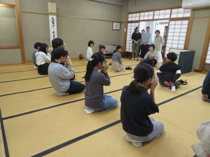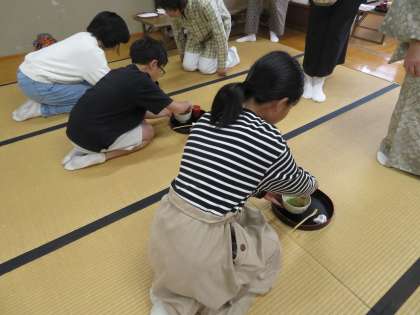 金曜日に2回目の茶道体験を行いました。今回は少しレベルアップして茶巾を使ったり、お茶菓子を切ったりということもしました。子どもたちは前回のことを思い出しながら頑張っていました。特にお茶を点てるところでは前回よりも上手にお茶を点てられた子が多く、驚きました!またお茶菓子は「ようかん」でしたが、普段はあまり和菓子を食べない子も多く「おいしい!」ととても喜んでいました。
