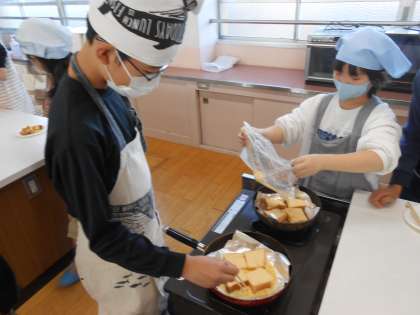 家庭科クラブでは、「フレンチトースト」を作りました。この日までに自分たちで材料などを考えて計画してきました。