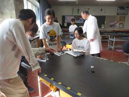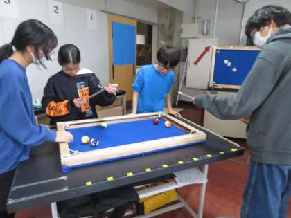 物理の授業では、「しょうとつ」に関わることを学びました。カーリングやビリヤードのゲームを通して物をぶつける距離や力について楽しく考える姿が見られました。