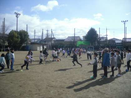 週2回、昼休み後に運動する時間「ジャンプアップタイム」は、3学期も行っています。今月は、5m先の友だちに向かってボールを投げて走る「パス&ラン」に挑戦しています。寒さの厳しい日が続いていますが、外で元気に遊んで、体力をつけてほしいです。