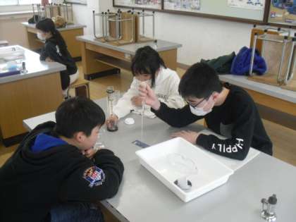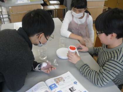 理科「もののとけ方」の学習では、水に溶けたものがどうなったのかを実験で調べています。水に食塩やミョウバンを溶かすと、溶かしたものが見えなくなったが、重さは変わらないことが実験で分かりました。このことから、水に溶けているが、その中に食塩やミョウバンは存在していると予想し、教室で水溶液を蒸発させて確かめています。班で協力し、片付けまでしてくれました。